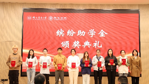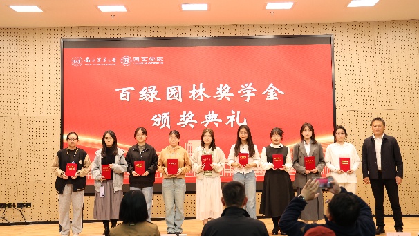 颁奖典礼上,参会嘉宾为获得缤纷助学金、心路助学金、百绿园林奖学金、厚德奖学金、宏旭达园林奖学金、坂田种苗企业奖学金、章镇奖学金的60余位学生逐一颁发荣誉证书。
