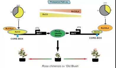 蔷薇属植物有一年单次开花、偶尔二次开花和连续开花三种类型,连续开花是指不受季节和日照长短的限制,只要生长条件合适就能开花,所以被普遍认为是日中性响应。根据开花所需的光照时间长短,可以将植物分为长日照植物、短日照植物和日中性植物。长日照植物拟南芥和短日照植物水稻的开花调控的研究已经取得较大进展,但人们对日中性植物的开花机制了解很少。该研究从BBX家族基因入手,解析了RcCO和RcCOL4在月季日中性成花中的调控机制。