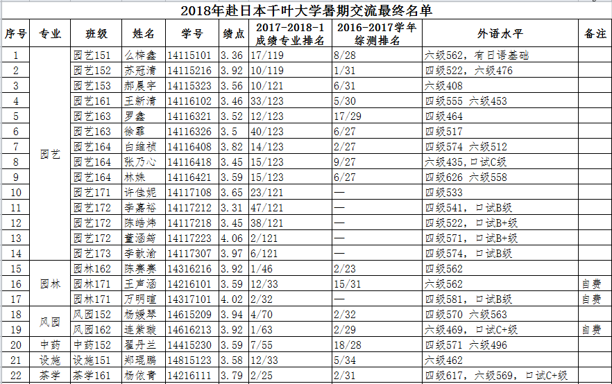 经个人申请、老虎机app 集中评审,拟推荐以下学生参加2018年暑期日本千叶大学访学项目并获得一定金额的项目资助,现将名单公示如下,如有异议,请于2018年6月10日前反映至生科楼B4010夏老师处,联系电话:025-84395075。