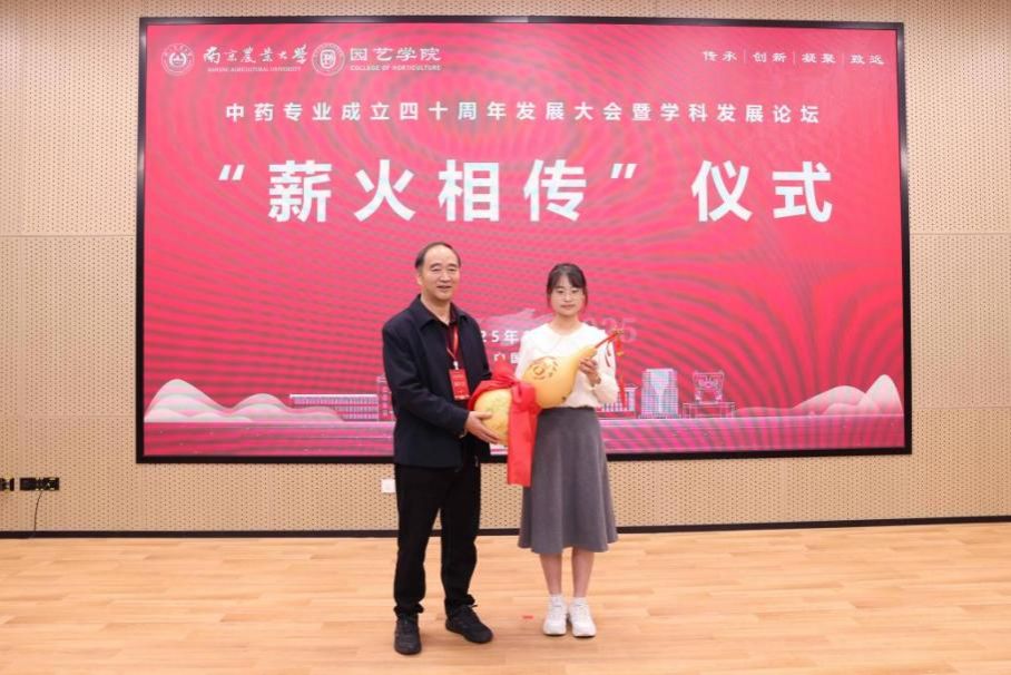 在读博士生唐思琪作为校友代表分别发言。大会还举行了“薪火相传”仪式,中药学专业创始人之一,国家药典委委员,俄罗斯工程院外籍院士郭巧生教授将象征悬壶济世精神的“宝葫芦”传递给2025级中药专业本科新生朱静轩同学。郭巧生回顾了中药专业四十年的发展历程,指出我校中药学是我国高等农林院校中首个中药专业和首个医学门类中药学一级学科硕士点,为国家中药事业的传承、创新和发展培养了大批人才,产出了丰硕成果。