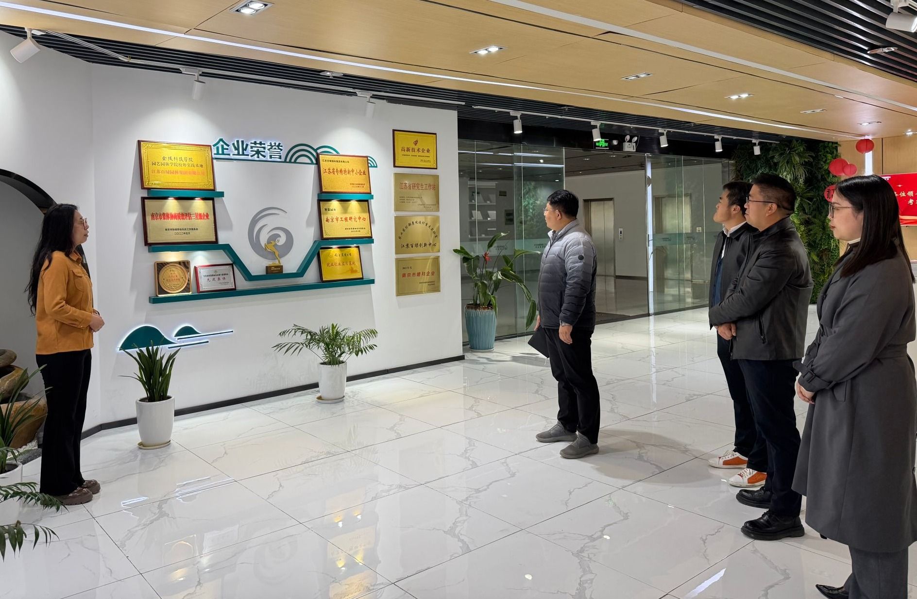 王海滨一行参观了企业展厅,详细了解了公司的发展历程、业务范畴、核心项目及技术成果。百绿园林作为一家集园林规划设计、施工养护、苗木培育与生态修复于一体的综合性企业,长期致力于绿色生态建设,在行业内具有显著影响力。展厅内,校企合作成果展示区尤为引人注目,体现了企业在技术研发、人才培养等方面与高校紧密合作的积极实践。