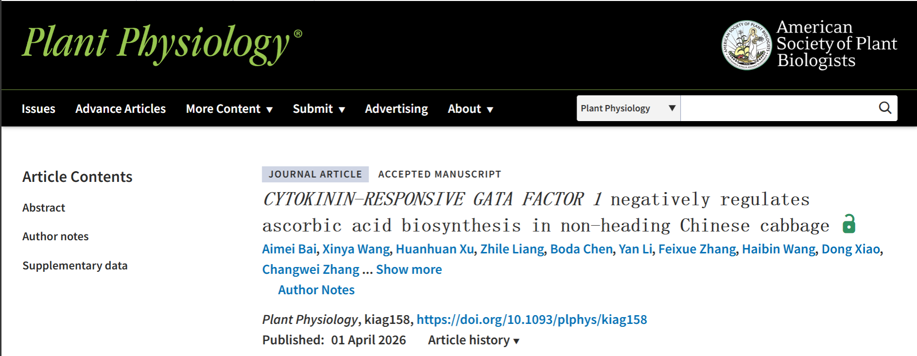 白菜系统生物学实验室在国际植物学期刊《Plant Physiology》在线发表题为“CYTOKININ-RESPONSIVE GATA FACTOR 1 negatively regulates ascorbic acid biosynthesis in non-heading Chinese cabbage”的研究论文,该研究锁定了调控AsA积累的关键GATA转录因子BcCGA1,揭示了BcCGA1通过直接抑制AsA合成关键基因转录负调控AsA积累的分子调控机制,为不结球白菜营养品质的分子改良奠定了遗传基础。
