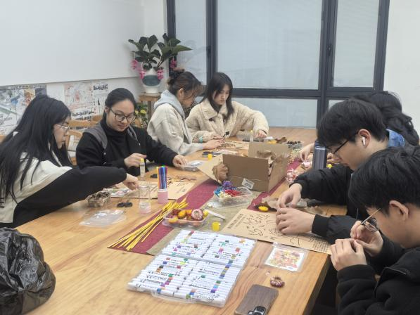 聚焦金陵文脉,九处地标“落叶重生”。党支部提前选取中山陵、南京长江大桥等9处南京历史地标,绘制卡通形象,按时间轴线梳理故事脉络,在图版附上地标故事。后续由支部党员、入党积极分子分组,利用前期分类晾晒的银杏、梧桐、槭树等叶片及各类干花素材,依据建筑肌理与色彩进行拼贴创作,历时两小时,将9张A3牛皮纸拼成近3米长卷,书写金陵城的千古文脉。