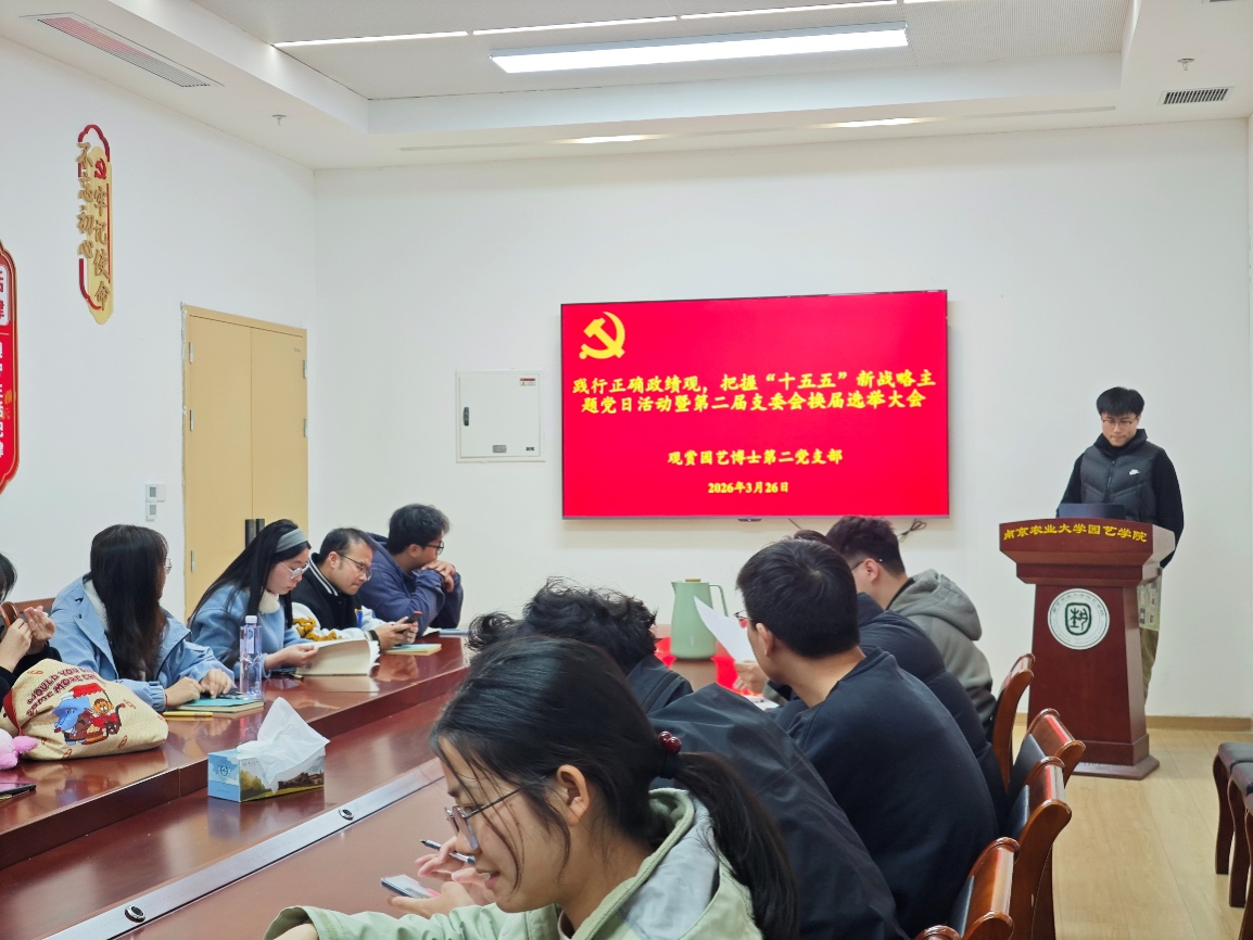 为深入学习贯彻正确政绩观,精准把握国家“十五五”时期重大战略部署,进一步加强党支部组织建设,充分发挥博士党员先锋模范作用,3月26日下午,观赏园艺博士第二党支部在园艺楼148会议室开展“践行正确政绩观,把握国家‘十五五’时期重大战略部署”主题党日活动,并召开第二届支委会换届选举大会。会议由党支部书记柳志勇同志主持,支部全体党员及入党积极分子参加。