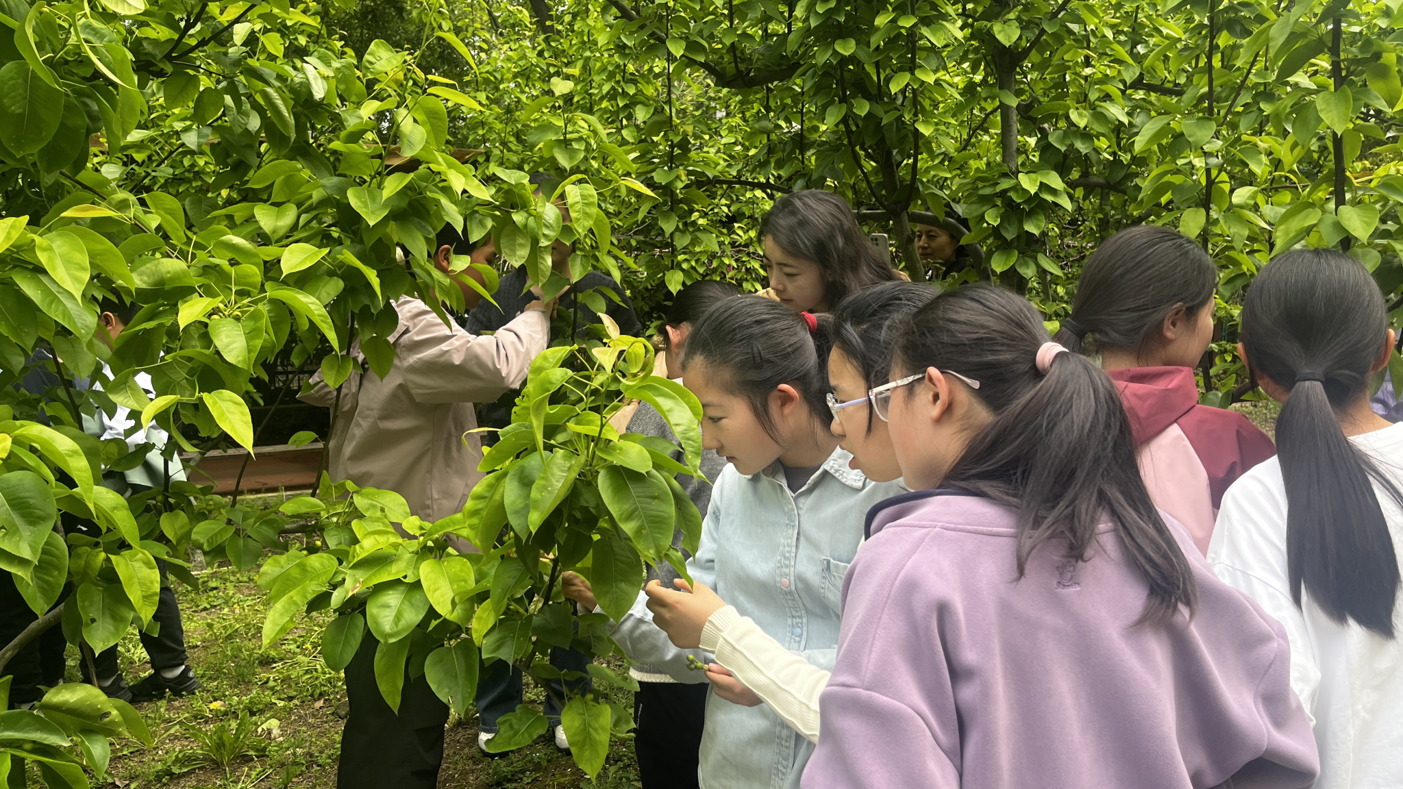 小学梨园内,齐开杰老师围绕梨树基本知识展开讲解,重点介绍叶芽的形态特征与生长规律,并现场教授疏果、修枝、去叶等操作的具体方法与意义,深入浅出的讲解让孩子们听得津津有味。果树博士第一党支部的博士生党员带领孩子们动手实践,将理论知识转化为真实体验。“为什么有的叶子要摘掉?”“梨树生病了怎么办?”面对孩子们接连不断的问题,博士生党员耐心解答,从病害防控到生长环境再到日常养护,一步步拓展着孩子们的知识视野,也让动手实践能力在探索中得到锻炼。